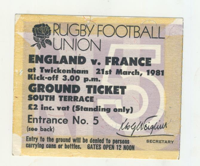 Original ticket for the match played at Twickenham on March 21st 1981. France won, to secure the Grand Slam.