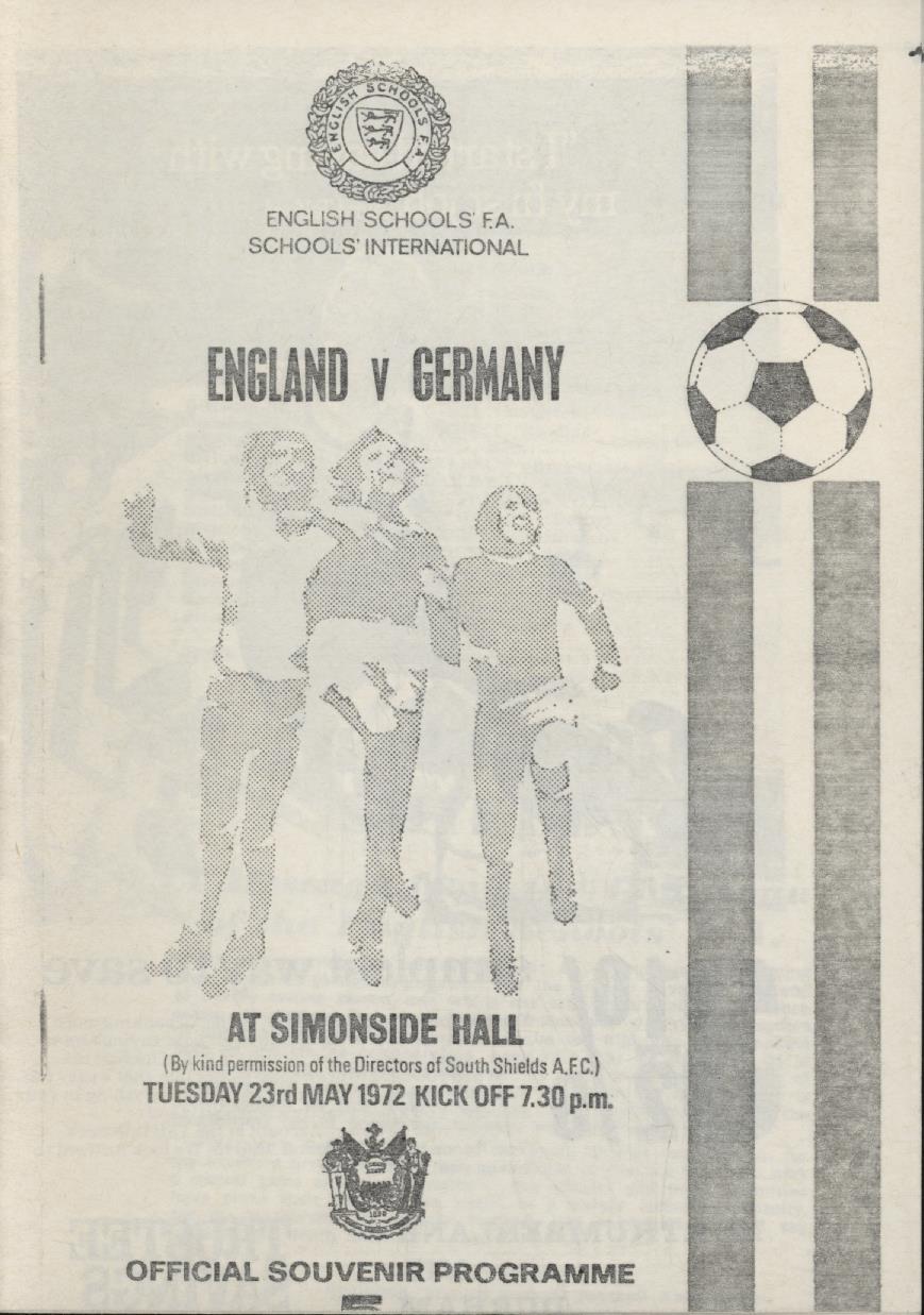 Official programme for the Schools' International between England v West Germany at Simonside Hall (South Shields) on 23rd May 1972. Ray Wilkins was representing England.