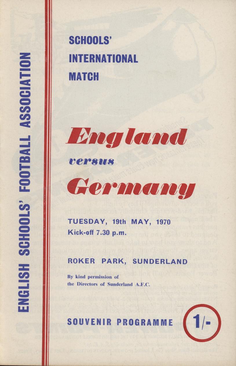 Official programme for the Schools' International between England v West Germany at Roker Park, Sunderland on 19th May 1970.