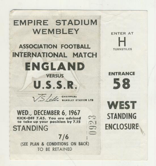 ENGLAND V U.S.S.R. 1967 FOOTBALL TICKET