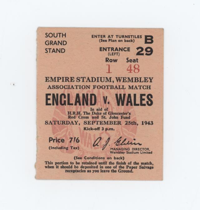ENGLAND V WALES 1943 FOOTBALL TICKET