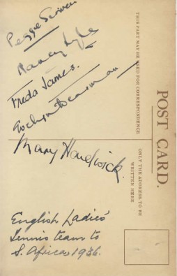 Tennis autographs on a postcard of the Union-Castle Line's "Winchester Castle": signed in ink on the reverse by Mary Hardwick, Peggie Scriven, Nancy Lyle, Freda James and Evelyn Dearman.