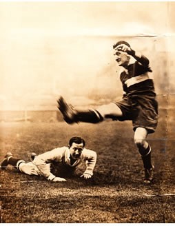 Black and white press photograph of the England practice at the H.A.C. ground before the Calcutta Cup, featuring Toft kicking and the captain, Gadney.