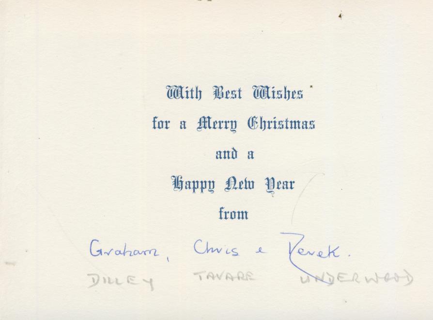 Christmas card sent from the England tour of Sr Lanka in 1981-2 with tipped-in real photograph of the team. Inscription by one of thre three Kent players in the squad 'from Graham (Dilley), Chris (Tavare) and Derek (Underwood).