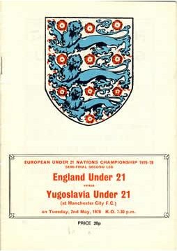 Official programme for the England v Yugoslavia Under 21 European Nations Cup Semi-Final, second leg, played at Maine Road, Manchester, May 2nd 1978. The match was drawn 1-1, Yugoslavia going through to the Final 3-2 on aggregate.