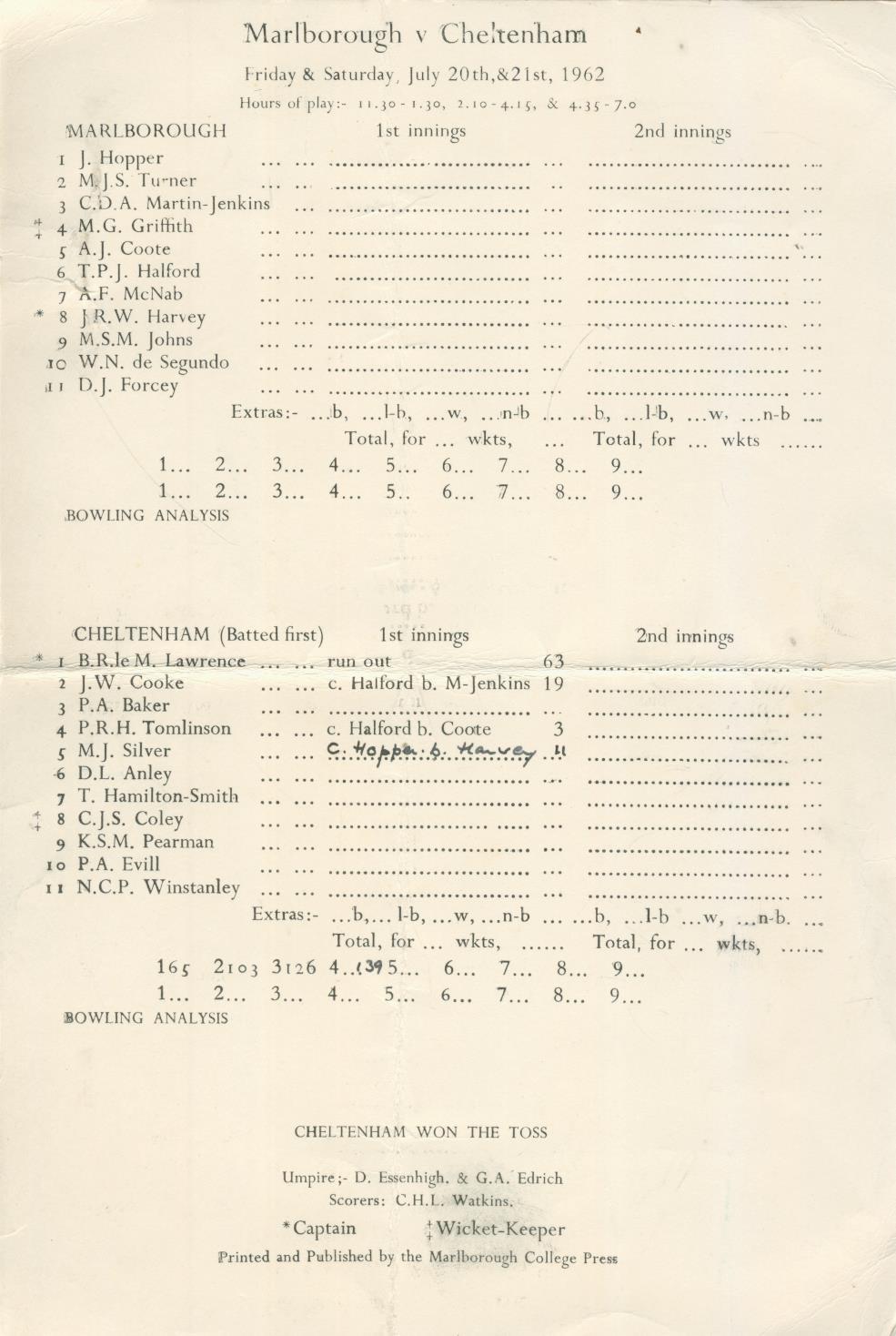 MARLBOROUGH V CHELTENHAM 1962 CRICKET SCORECARD