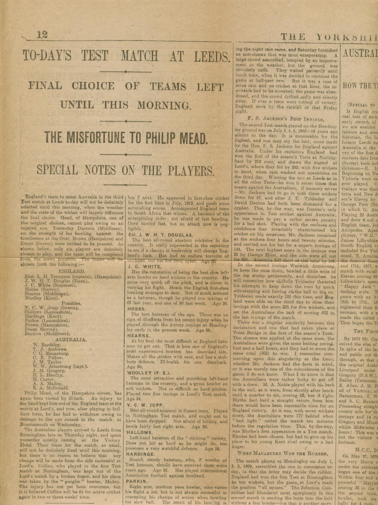 Half page from the Yorkshire Post, dated July 2nd, 1921. Contains a large article about the Headingley Test match that started that day, including team selection. Also includes pen portraits of all the players (from both sides) and reminiscences of interesting moments in previous Test matches at the ground.