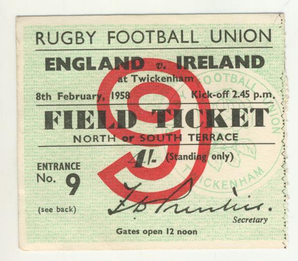 ENGLAND V IRELAND 1958 RUGBY TICKET