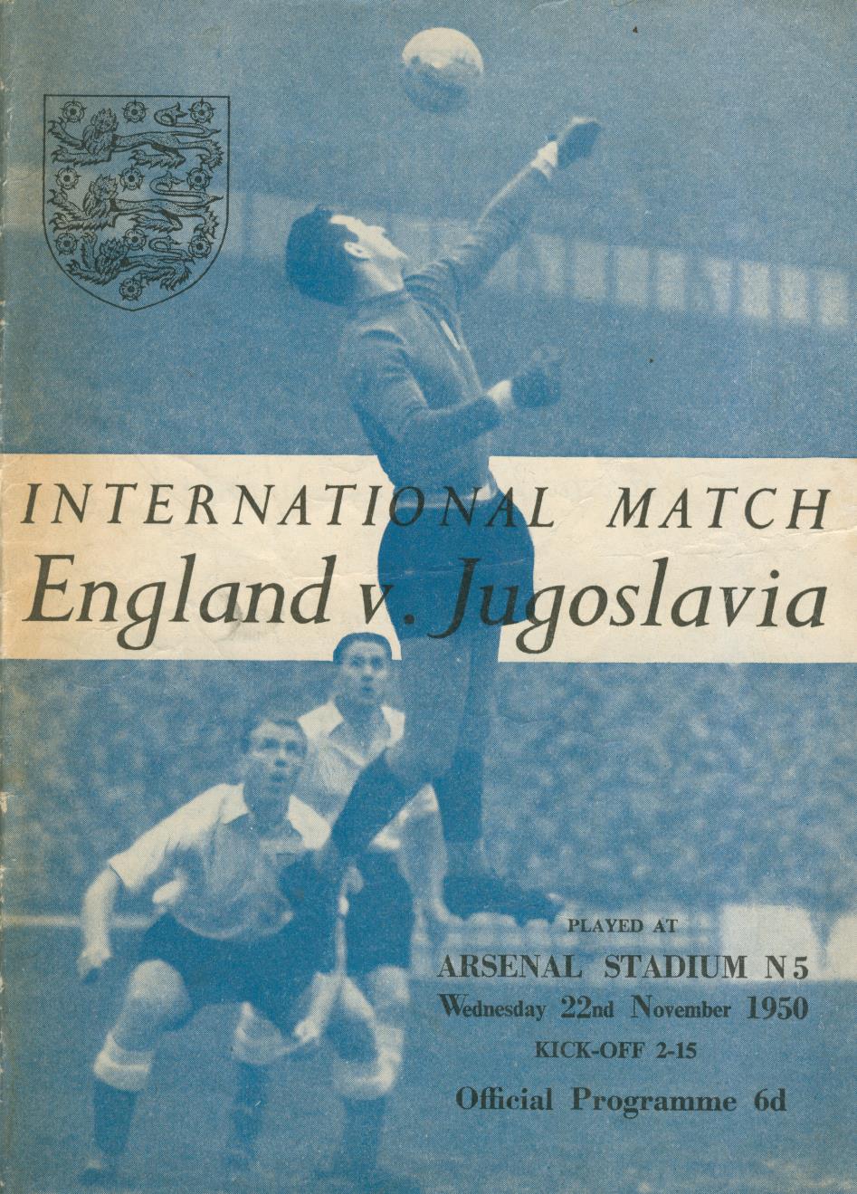Official match programme for the game played at Highbury on November 22nd 1950. Signed to the team sheet by the full England team - Williams, Ramsay, Eckersley, Watson, L. Compton, Dickinson, Hancocks, Mannion, Lofthouse, Baily and Medley.