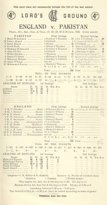 ENGLAND V PAKISTAN 1962 (LORD'S) CRICKET SCORECARD