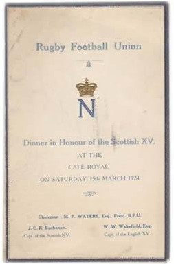 Menu card for a dinner in honour of the Scottish XV, after the England-Scotland Calcutta Cup match, at the Cafe Royal, London, on 15 Mar 1924. Captained by the great William Wavell Wakefield, England won 19-0 in the final game of their Grand Slam season.