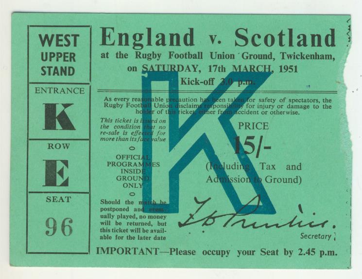 ENGLAND V SCOTLAND 1951 RUGBY TICKET