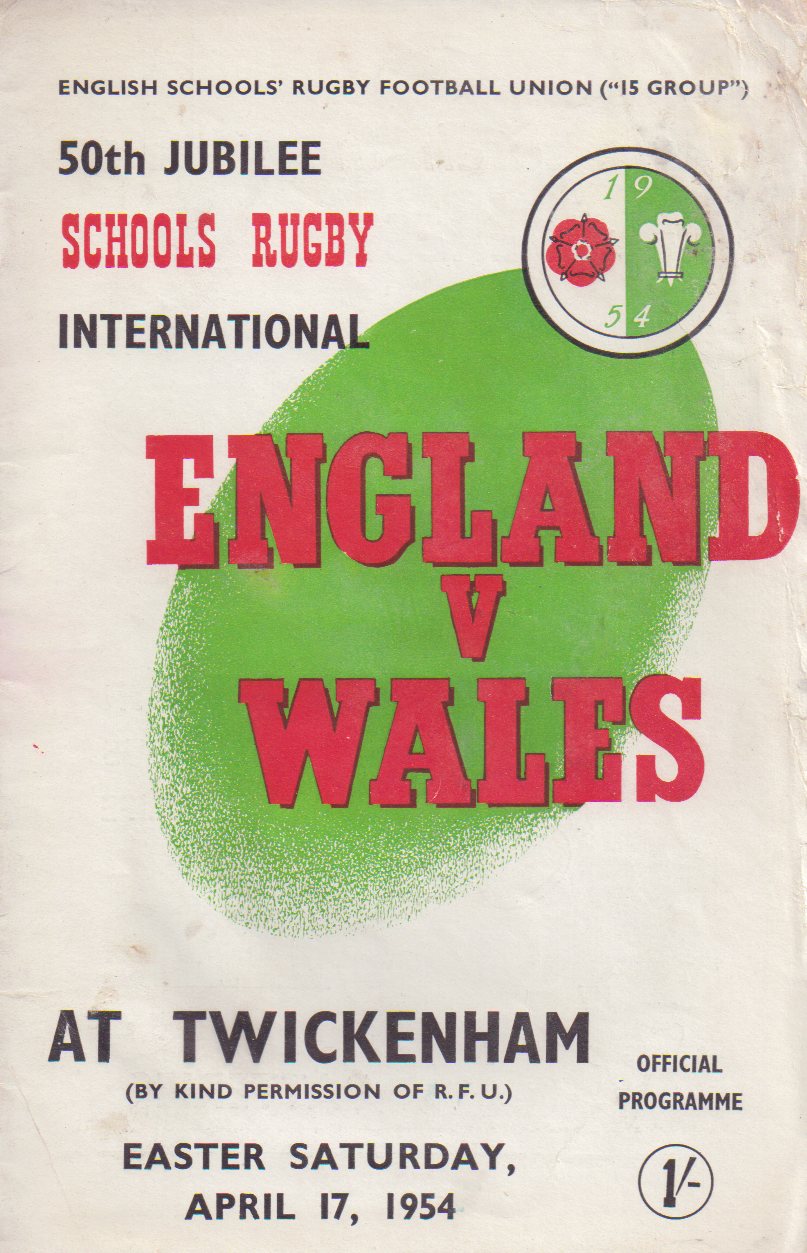 Official Rugby Union match programme from the Schools' Rugby International between England and Wales played at Twickenham on the 17th of April 1954 as part of the English School's RFU's 50th Jubilee celebrations.
