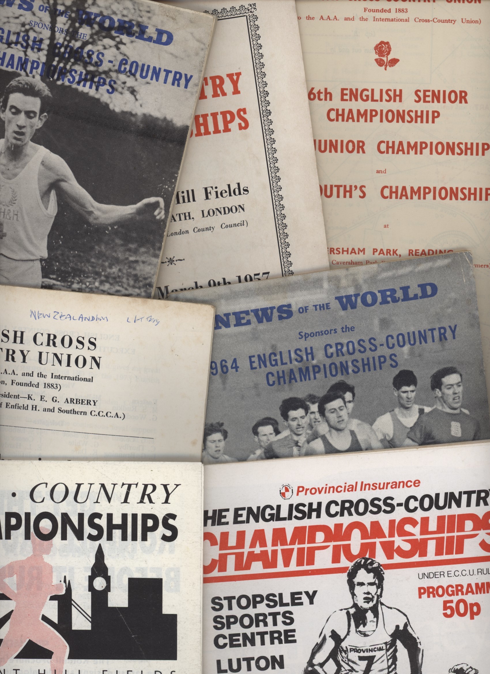 Official programmes for the English cross-country Championships for 1953, 1957, 1963, 1964, 1973, 1983 and 1993. The first won by Gordon Pirie and the last by Richard Nerurkar.