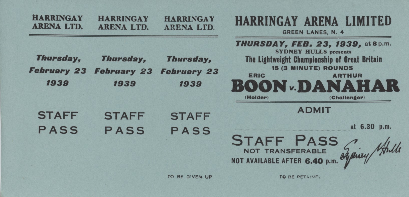Original ringside Staff ticket for the Lightweight Championship of Great Britain fight at Harringay Arena on February 23rd, 1939. This was the first ever live televised boxing match, shown live by the BBC and simultaneously in several cinemas. This preceded the first televised heavyweight match between Baer and Nova, which was held on June 1, 1939. Boon finally won an epic encounter by TKO in round 14.