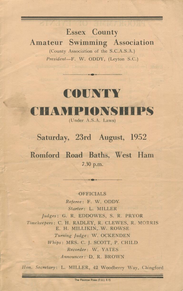 ESSEX COUNTY CHAMPIONSHIPS 1952 SWIMMING PROGRAMME