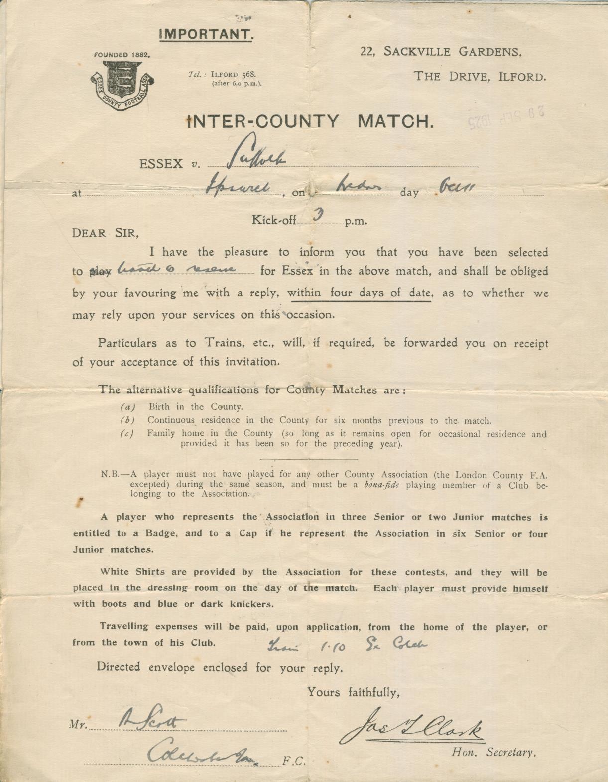 Selection letter for the County football match between Essex and Suffolk, played at Ipswich. The letter is stamped September 29th 1925 and is addressed to R. Scott of Colchester Town, who has been selected to travel as a reserve for the match. Colchester Town folded in 1937 soon after the emergence of the professional club Colchester United.