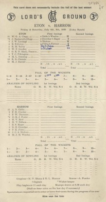 ETON V HARROW 1958 CRICKET SCORECARD