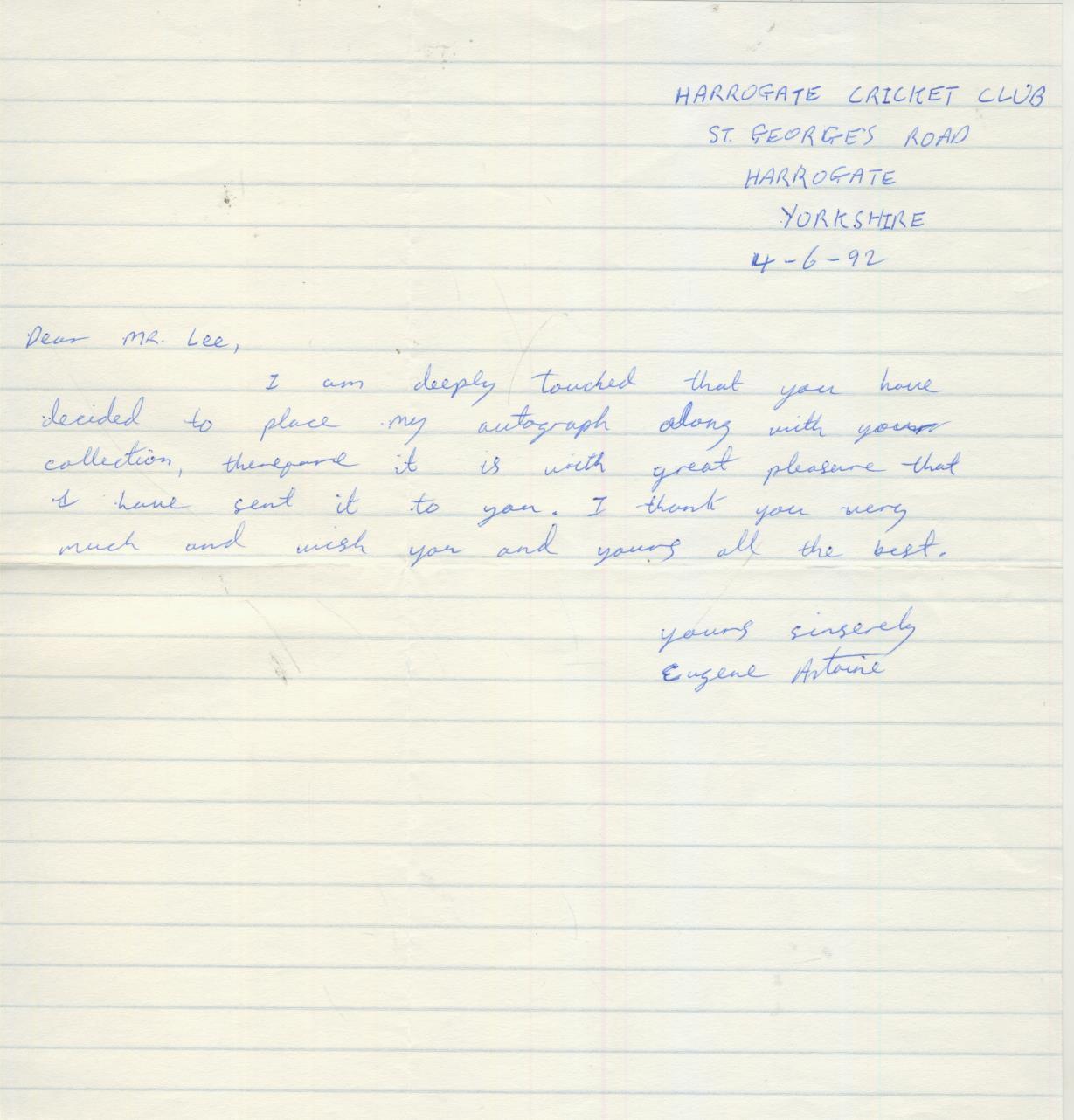 Cricket » Cricket Autographs » Cricket Letters » EUGENE ANTOINE (TRINIDAD & WEST INDIES A) 1992 CRICKET LETTER