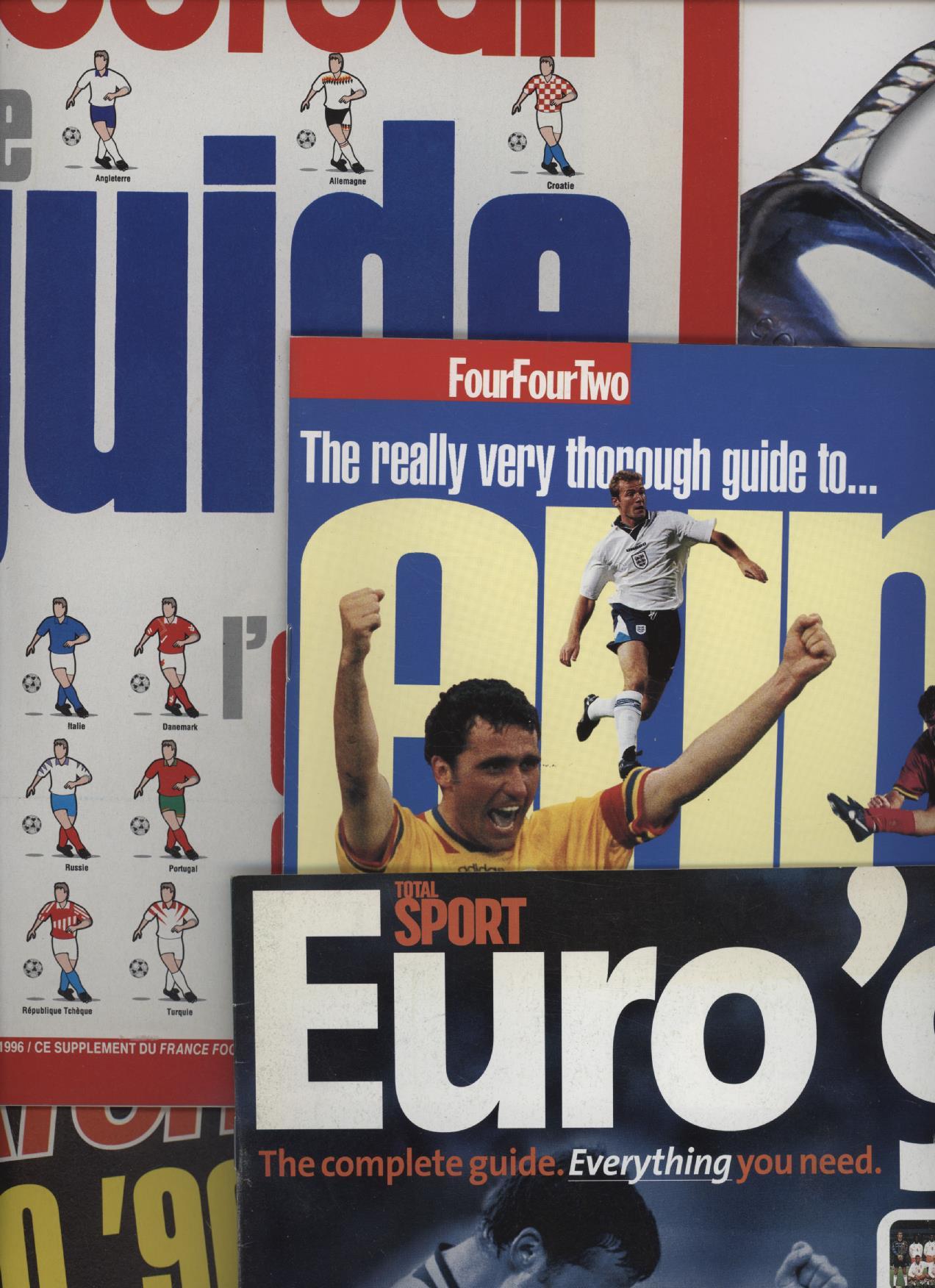 A nice collection of magazines and brochures relating to the football European Championships of 1996, including the official FA / BBC 162pp glossy guide plus supplements from newspapers and publications such as FourFourTwo and Match.