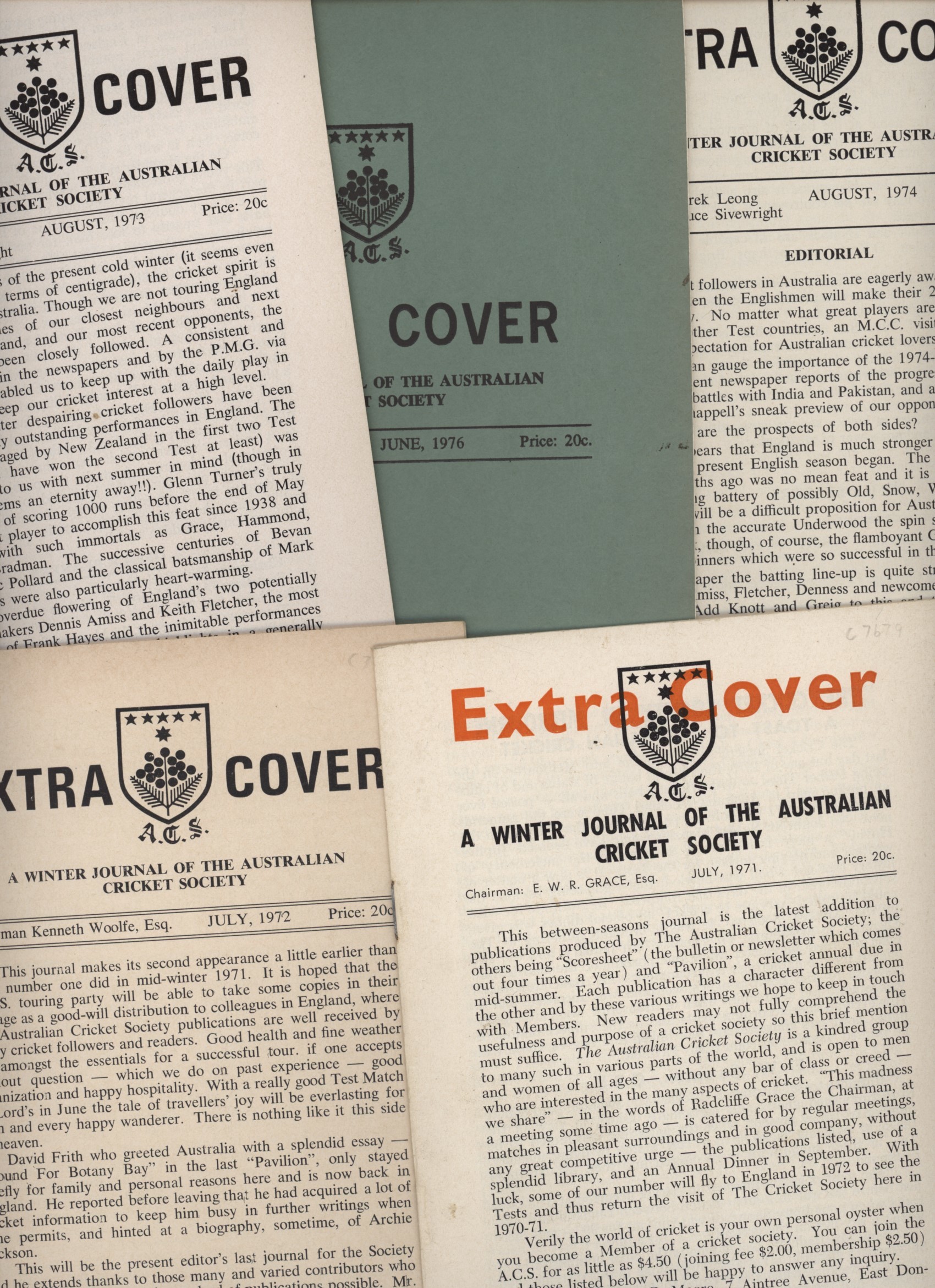 EXTRA COVER - A WINTER JOURNAL OF THE AUSTRALIAN CRICKET SOCIETY, 1971-1974 & 1976 (5 ITEMS)