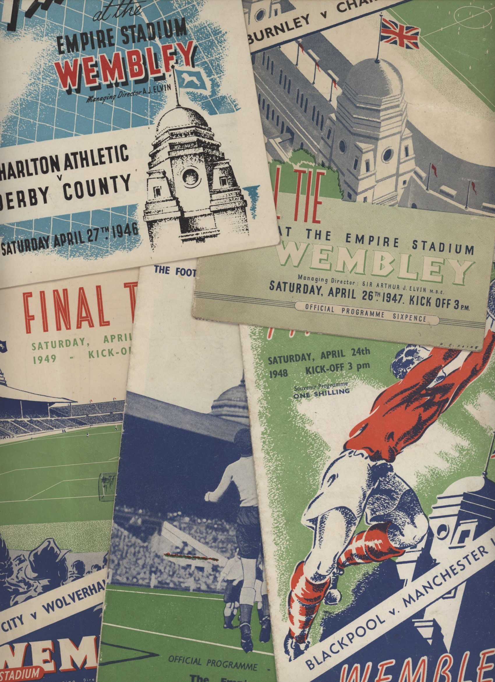 A collection of 51 post-War F.A. Cup final football programmes, including all replays. They start with Charlton Athletic v Derby County in 1946 and end with Nottingham Forest v Tottenham Hotspur in 1991. More modern ones can be added if desired. The programmes from 1946 to 1984 are slipped into two high quality programme files, and those from 1985 to 1991 (which are A4 in size) are in a normal file.