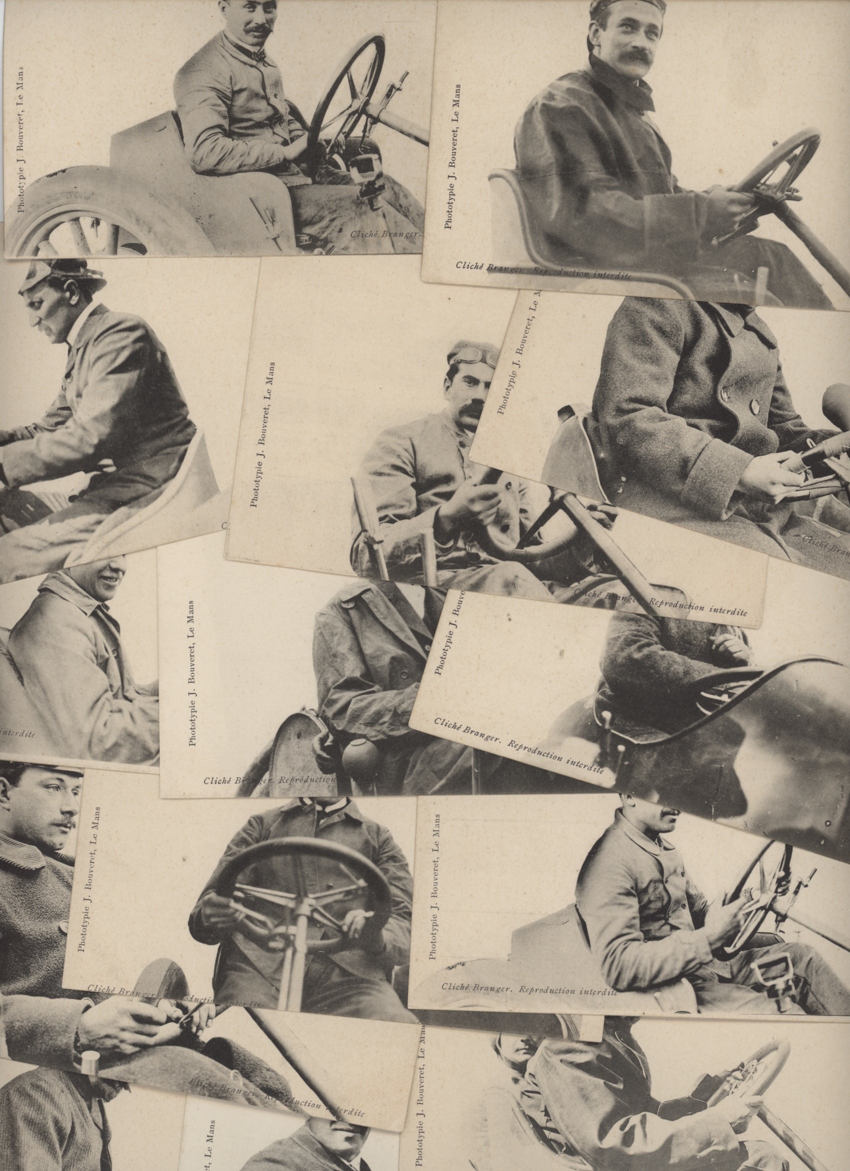 19 original postcards. Each published by J. Bouveret of Le Mans from photographs by Maurice-Louis Branger. Includes a map of the circuit and 18 individual drivers (and cars), including the winner Ferenc Szisz and Albert Clement. The 1906 race was the first French Grand Prix and was hosted by the Automobile Club de France (ACF). It was created at the initiative of the French automotive industry as an alternative to the Gordon Bennett Cup.