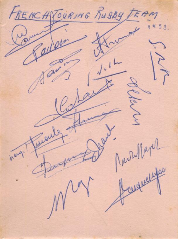 Album page with the autographs of 14 (possibly 15) members of the French rugby union team that toured South Africa in 1958. The French were not expected to achieve much but were to finish the tour as the very first team to win a Test series in South Africa. This is still regarded as one of the great achievements in French rugby. French autographs are notoriously difficult to decipher -confirmed autographs include Dupuy, Marquesuzaa, Rancoule, Fremaux and Casaux.