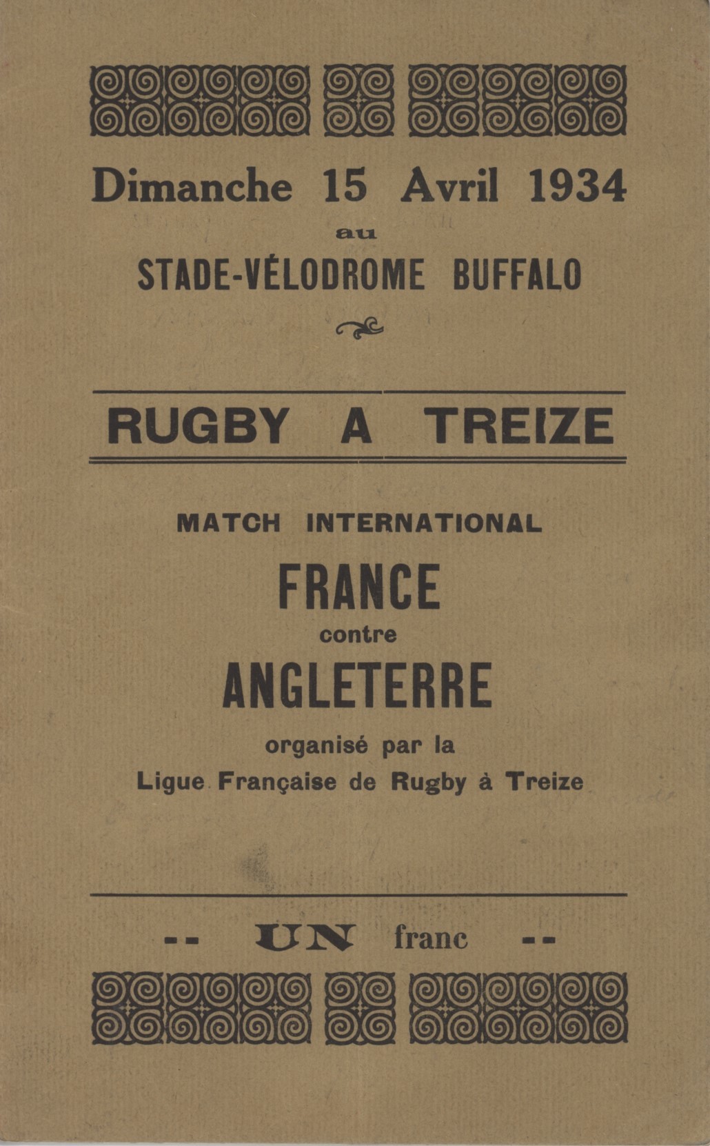 Official programme for the rugby league match played on April 15th, 1934 at Stade Buffalo in Paris. This was France's first ever international rugby league match, which was won by the visitors 32-21.
