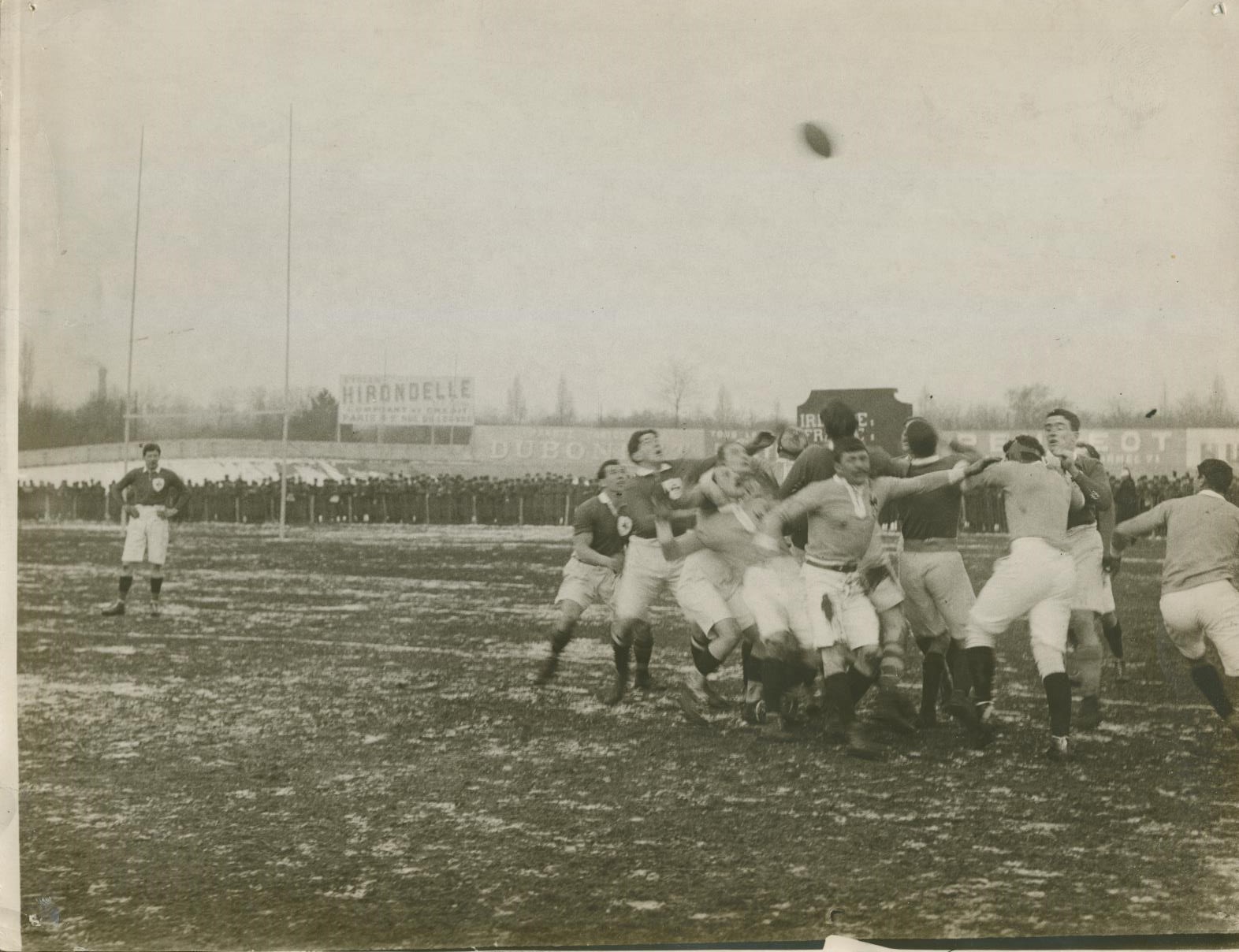 Original b/w Press photograph showing a line out at a France v Ireland match in Paris around 1910.