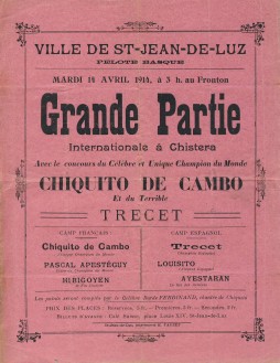 Small printed poster advertising a Pelota match, played at Saint-Jean-De-Luz on April 14th, 1914. A French team, including Chiquito De Cambo, took on a Spanish team which included Trecet, the Spanish champion.