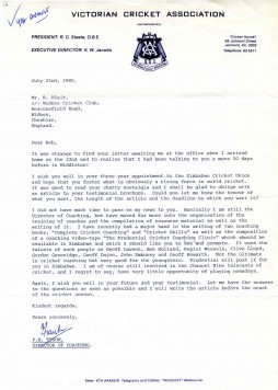 Cricket autograph. Typed letter on "Victorian Cricket Association" headed notepaper to Bob Blair (New Zealand), regarding a contribution to Blair's testimonial brochure. Signed in ink "Frank".