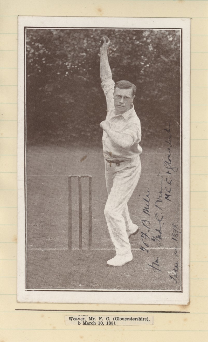 Original photographic postcard of Frederick Weaver in bowling pose. Signed to the front in ink "To F.B. Milne, from Fred C. Weaver - M.C.C. and Gloucestershire. Taken in 1898". The item comes from an album of signed cricket items put together by the renowned collector and historian G. Neville Weston - some of the images had previously belonged to F.B. Milne. The card is laid down to lined paper