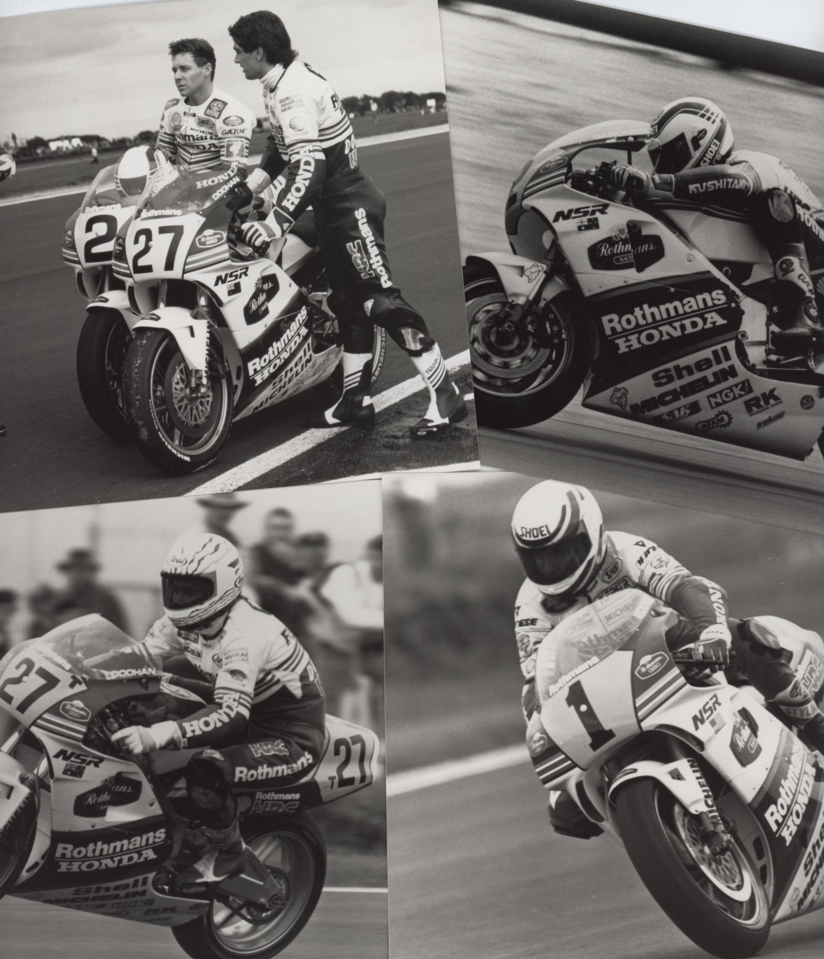 A set of four promotional photographs, published by Rothmans, of Wayne Gardner, Eddie Lawson and Michael Doohan on their bikes during the 1989 season. The fourth photo is of the three racers talking on the side of the track.