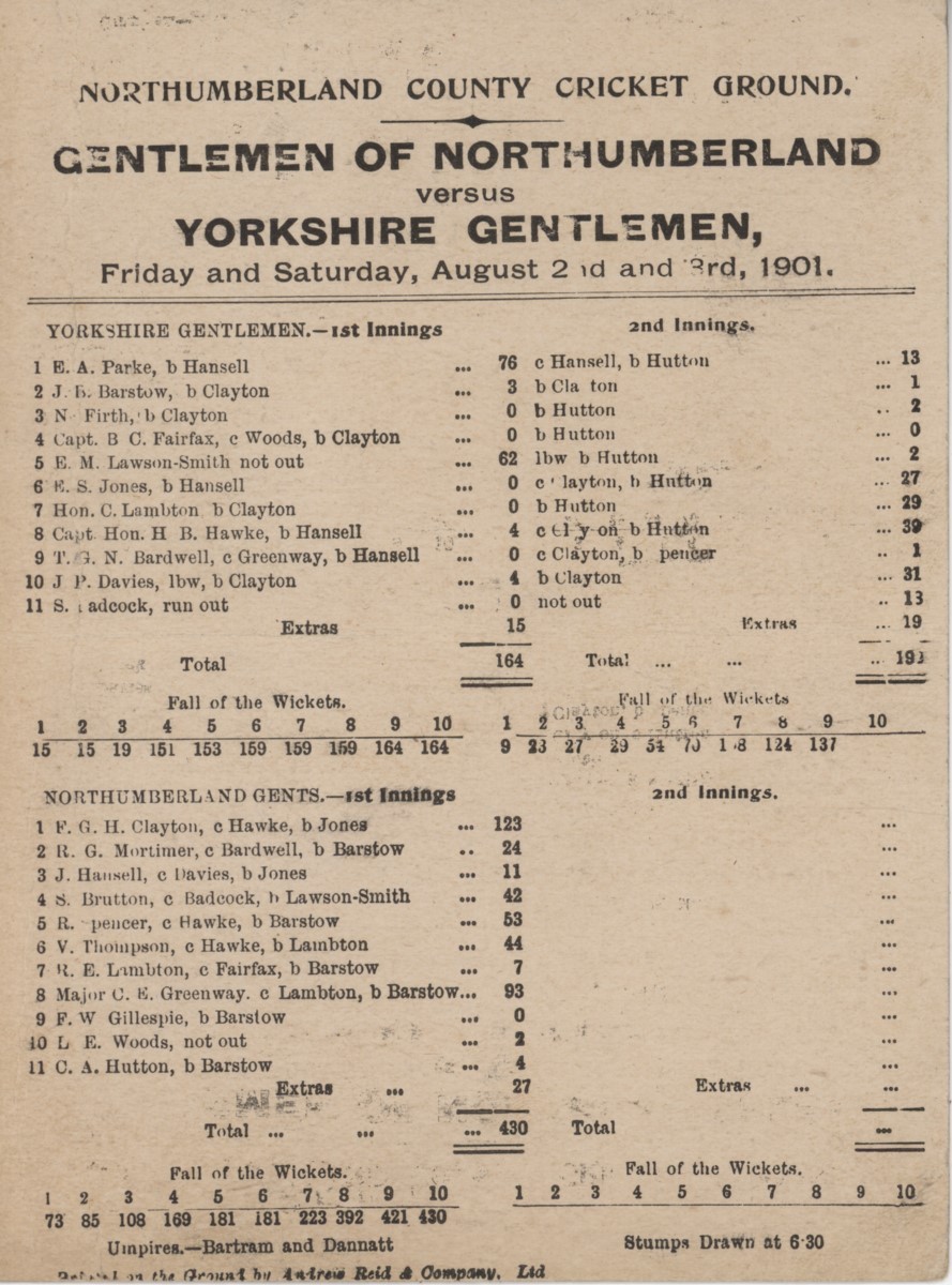 Original scorecard from the match played on August 2-3, 1901. Northumberland won by an innings thanks to a century from F.G.H. Clayton.