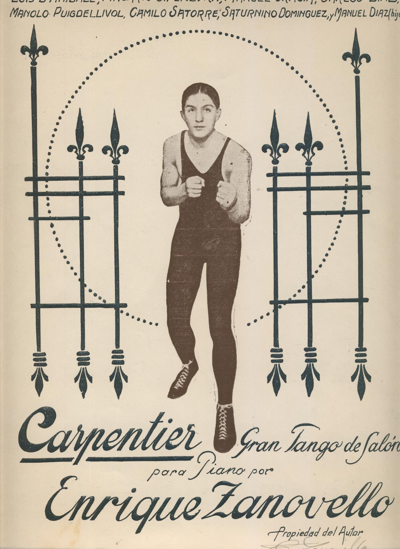 Musical score for a "Gran Tango de Salon", presumably based on the life of Georges Carpentier, and performed on the piano by Enrique Zanovello. Carpentier is seen in fighting pose to front. Signed on the front by Zanovello.