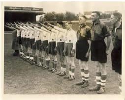 Original black and white Press photograph of a German Police football team giving a Nazi salute before a friendly match against the Sussex Police at the Goldstone Ground, Brighton on 23 August 1938. The local police won the match 3-2.