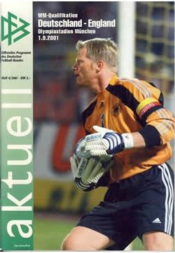 Official programme for the World Cup qualifying match between Germany and England played at the Olympic Stadium, Munich, September 1st 2001. England won devastatingly 5-1, Owen scoring a hat-trick.