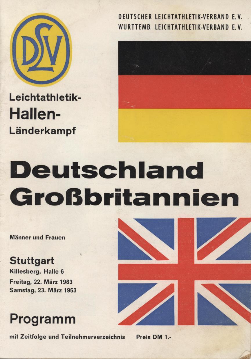 Official programme for the athletics match held in Stuttgart on March 22-23, 1963.