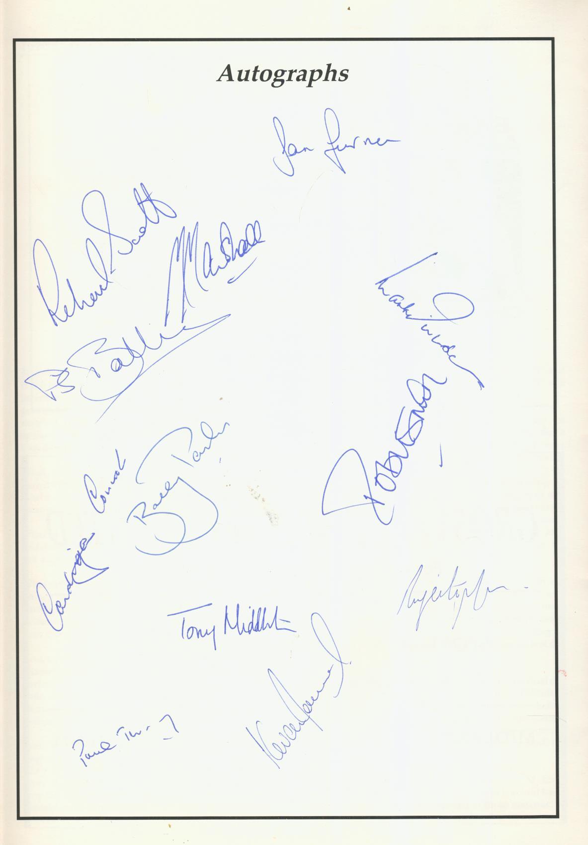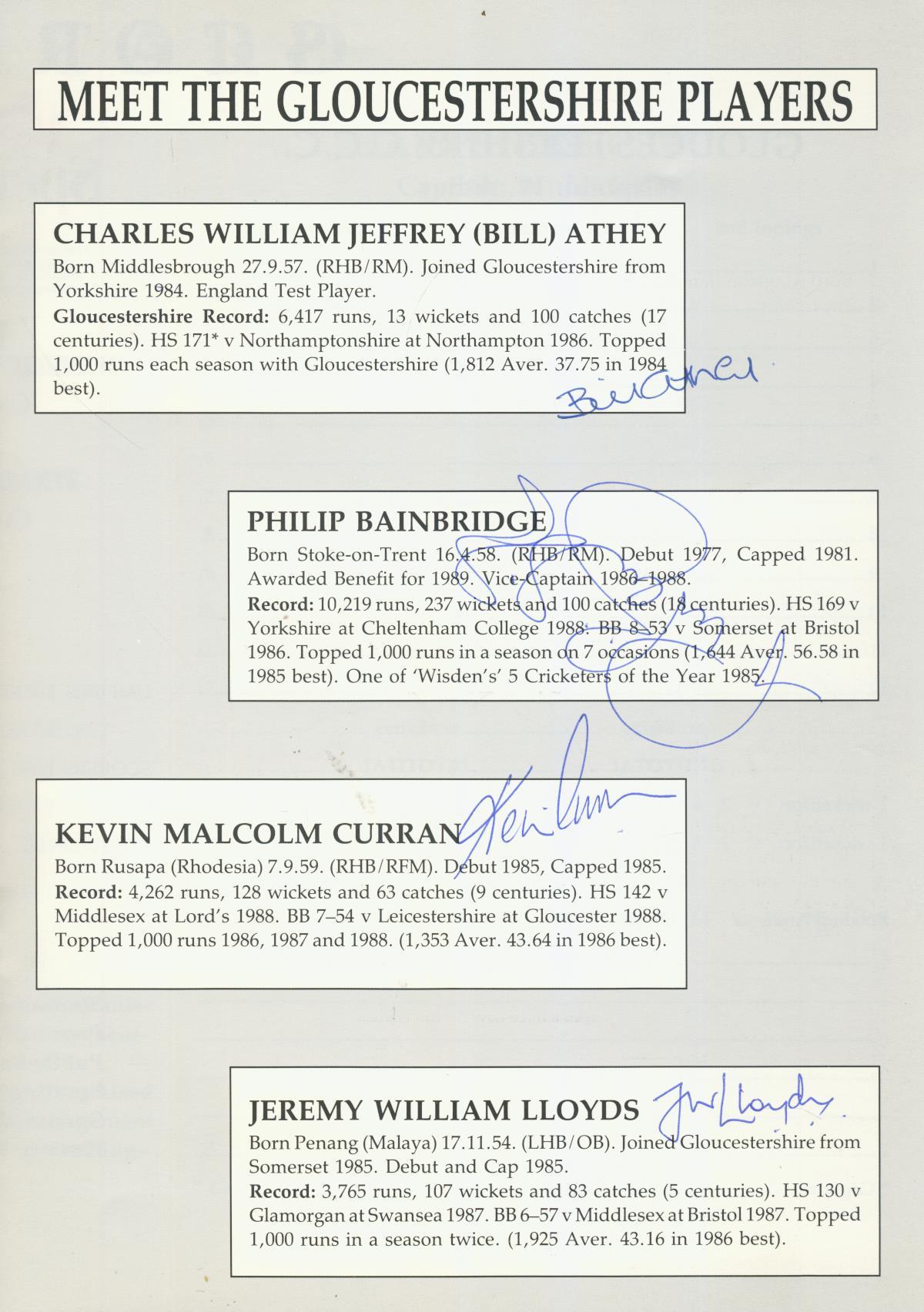 Official programme for the Britannic Assurance County Championship match, played at Bristol on September 13-16 1989. Signed to their player profiles by 9 Gloucestershire players and to the autograph page by 12 Hampshire players. The Gloucs players include Lawrence, Romaines, Athey, Curran and Lloyds - and the Hants players include Marshall, R Smith, Connor, James, Terry, Nicholas and Parks.