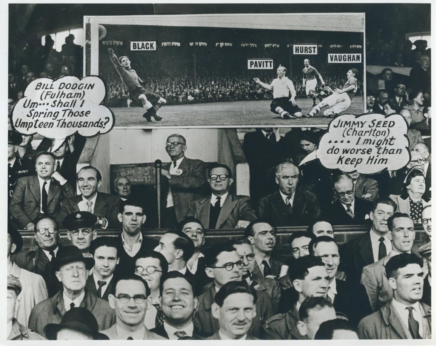 Black and white composite photograph showing the crowd, including the two managers, at a match between Fulham and Charlton Athletic in the early 1950s. The smaller photograph shows Charlie Vaughan scoring past Ian Black with Pavitt and Hurst looking on. The two managers are given speech bubbles - Dodgin: "Um ...shall I Spring those Umpteen Thousands?" and Jimmy Seed: "...I might do worse than Keep him".