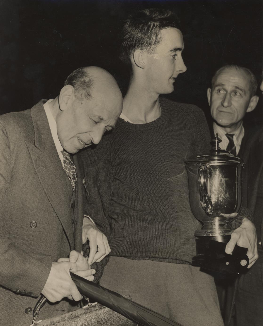Original Press photograph of Pirie after setting a new six-mile world record at White City on July 10th, 1953. Sir Adolph Abrahams is taking his pulse soon after the race.