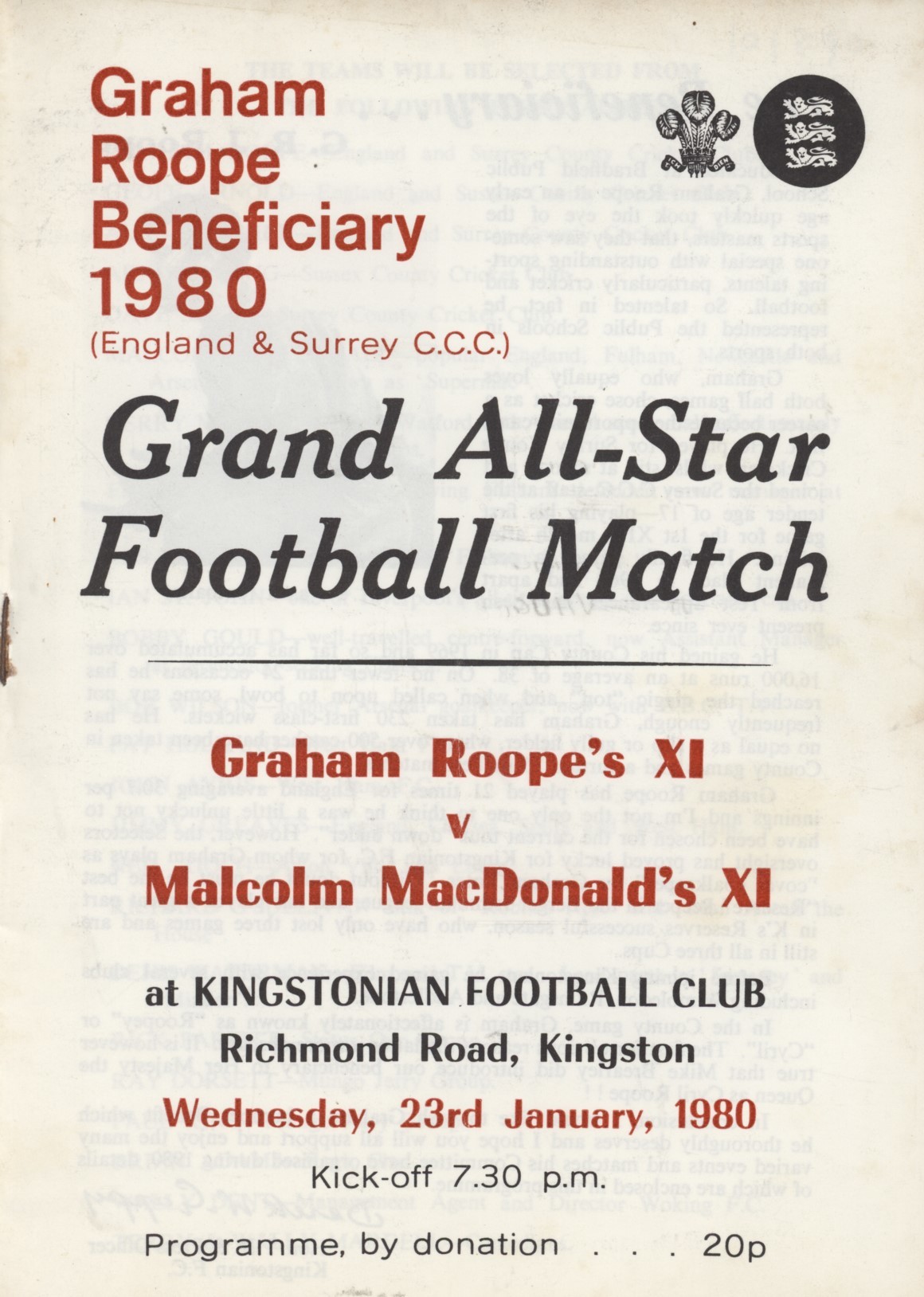 Official programme for the football match played at Kingstonian on January 23rd, 1980. The match was played in aid of Graham Roope's Beneficiary. Roope played cricket for Surrey and England. The teams included the two captains plus Fred Callaghan, John Ayris, Alan Butcher, Richard O'Sullivan, Ian St. John, Paul King (Mungo Jerry), Terry Mancini, Arnold Long, Bob Wilson and Denis Waterman.