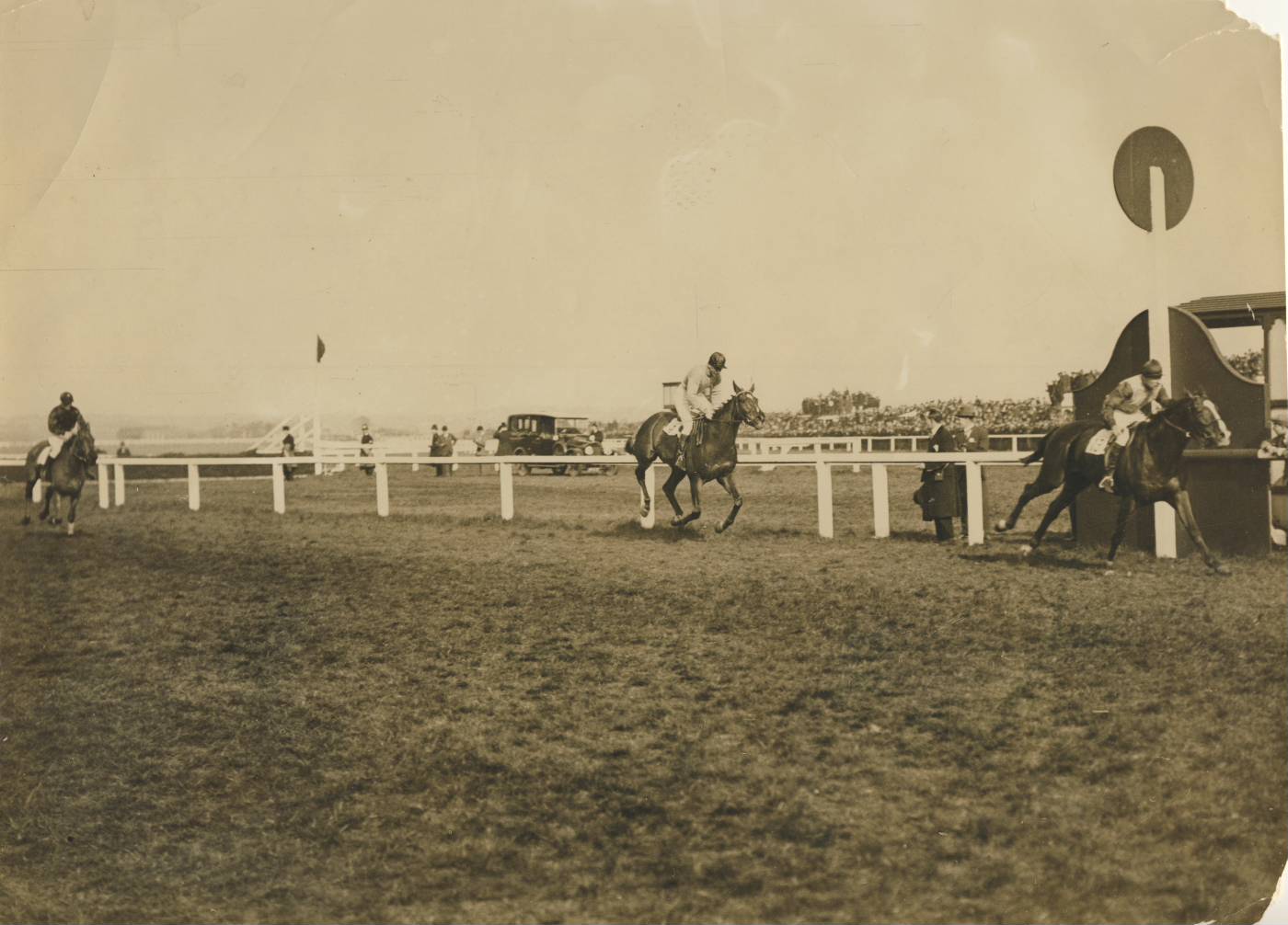 Original Press photograph of the final stages of the 1925 Grand National at Aintree. It shows Major John Wilson crossing the winning line on Double Chance, closely followed by Old Tay Bridge and Fly Mask. This was the first year that a tape was used at the start of the race.