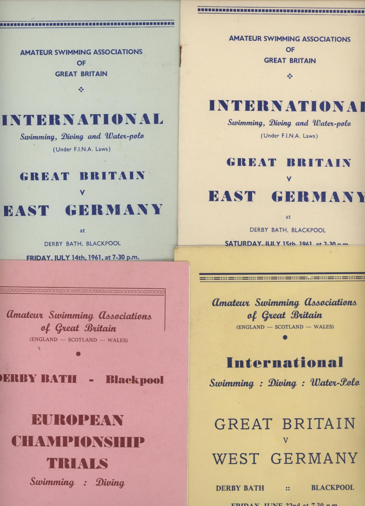Four programmes for international swimming meetings held at Derby Bath, Blackpool - GB v East Germany (July 14, 1961); GB v East Germany (July 15, 1961); GB v West Germany (June 22, year not stated) and European Championship Trials (July 21, 1962).