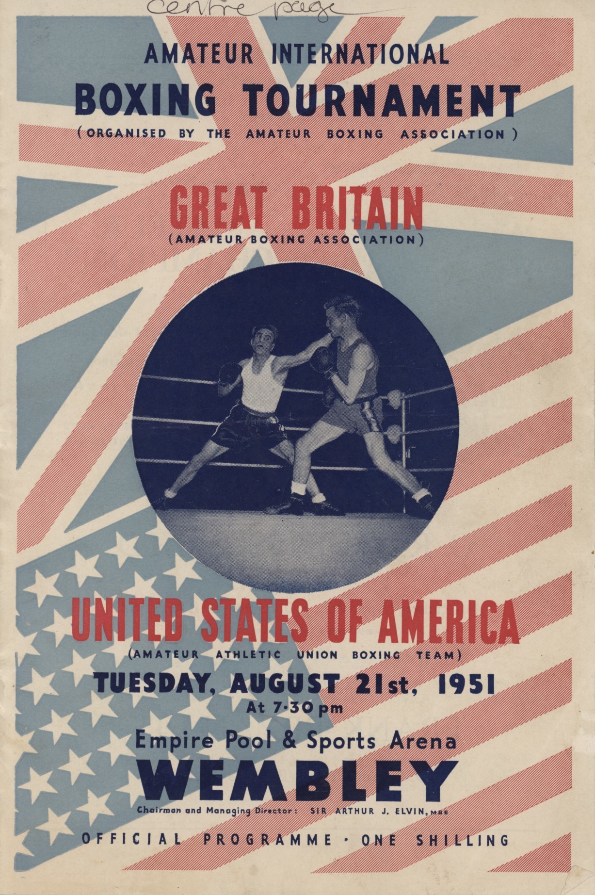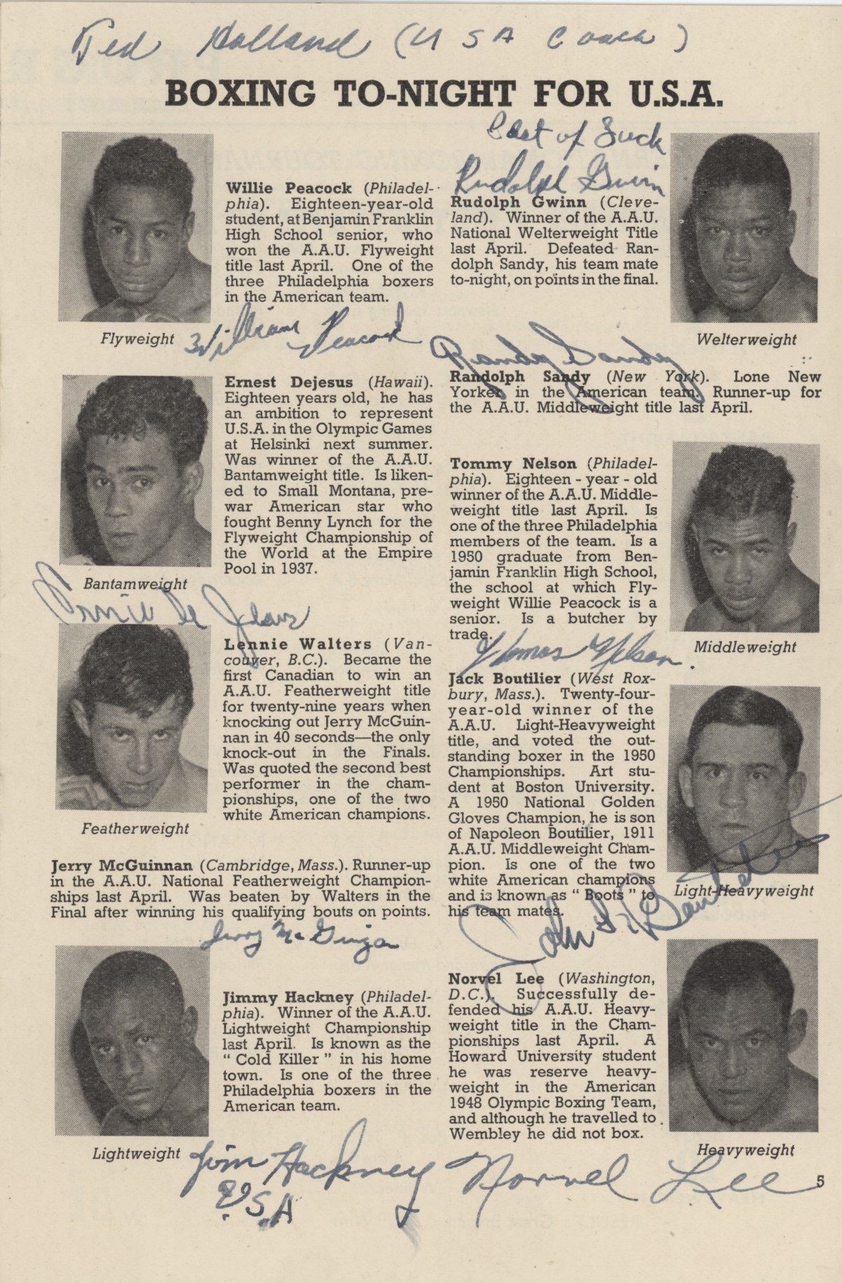 Official programme for the boxing tournament that took place at Wembley on August 21st, 1951. Signed inside by 9 American boxers plus their coach, and 7 British fighters, each to their pen portraits. These include Rudy Gwinn, Randy Sandy, Tommy Nelson, Jack Boutilier, Norvel Lee, Jim Hackney, Jerry McGuinnan, Ernest Dejesus, Willie Peacock, Richie Jenkins, Freddie Reardon, Terence Budge, Alf Lay, Arthur Howard, Myles Fenlon and Peter Toch. The programme belonged to Johnny Hurgood, who fought Rudy Gwinn. Gwinn has further signed the first page.