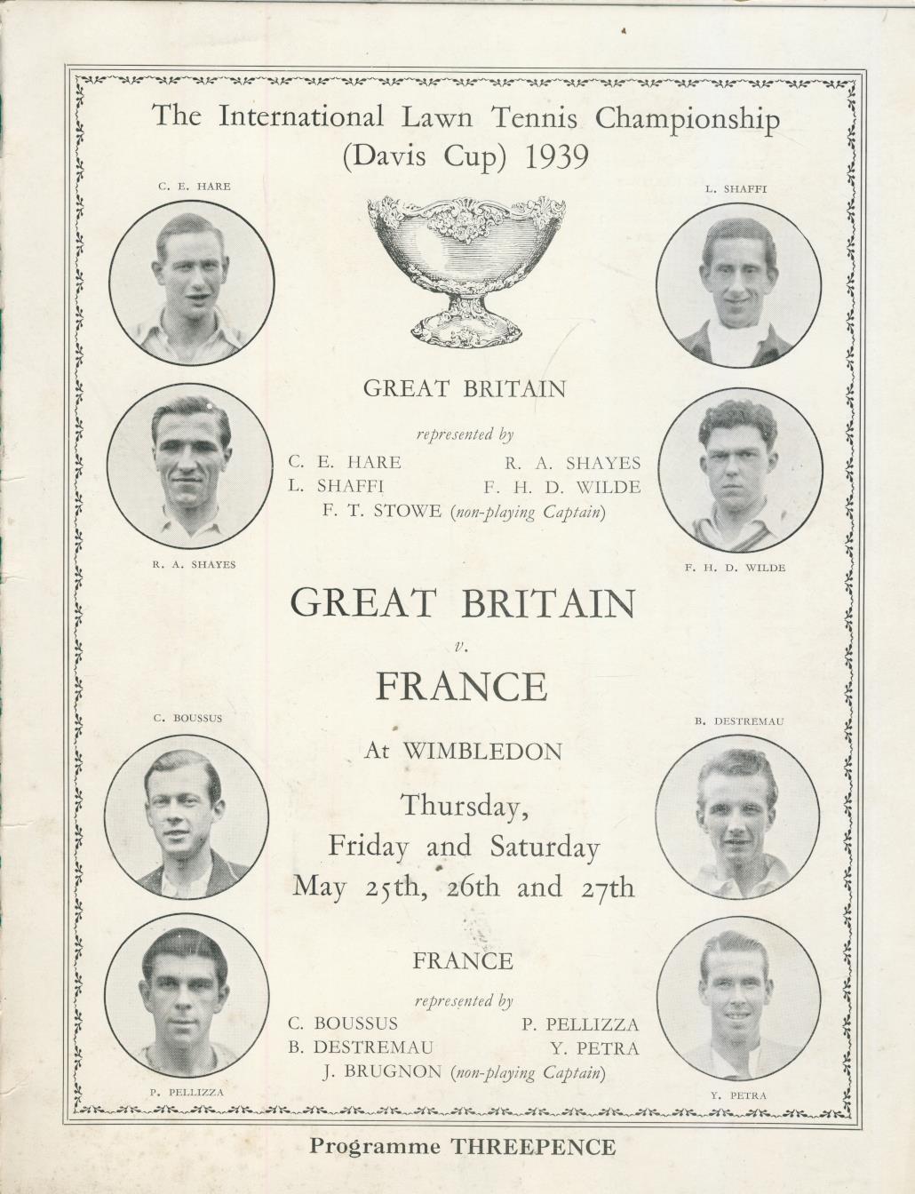GREAT BRITAIN V FRANCE 1939 (DAVIS CUP) TENNIS PROGRAMME
