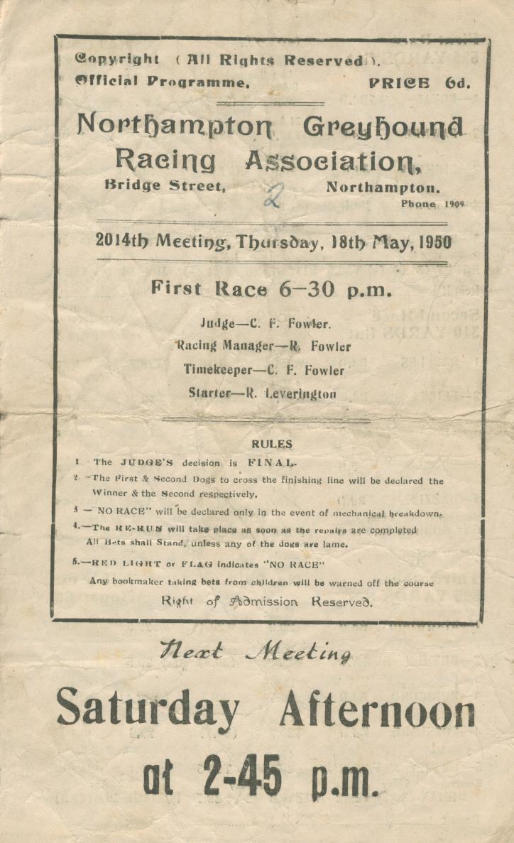 GREYHOUND RACING CARD - NORTHAMPTON GREYHOUND RACING ASSOCIATION, 18 MAY 1950