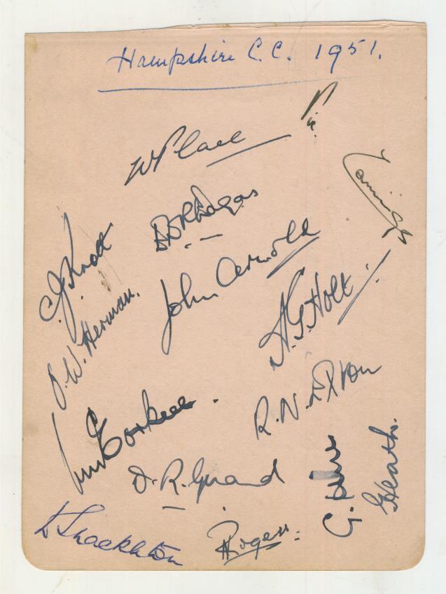 Album page. Signed in ink by 13 Hampshire players from the 1951 season or earlier - Eagar, Cannings, Hill, Rogers, Knott, McCorkell, Shackleton, Herman, Holt, Exton, Heath, Guard and Arnold. Although it seems that the autographs were collected in 1951 the last 6 players had already retired by then. Also signed by Lancashire's Winston Place.