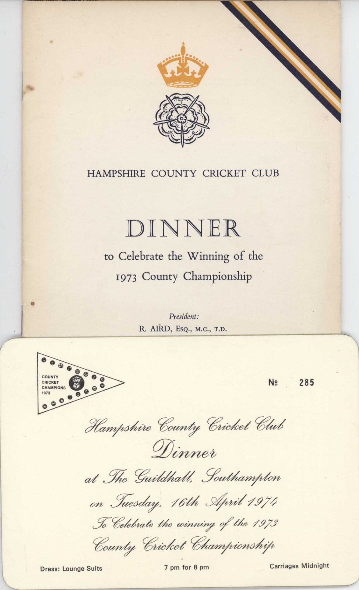Official Cricket dinner menu and toast list from the dinner held at the Guildhall, Southampton on the 16th April 1974 to celebrate winning the 1973 County Championship. Includes a full list of members and guests. Comes with the original invitation card.